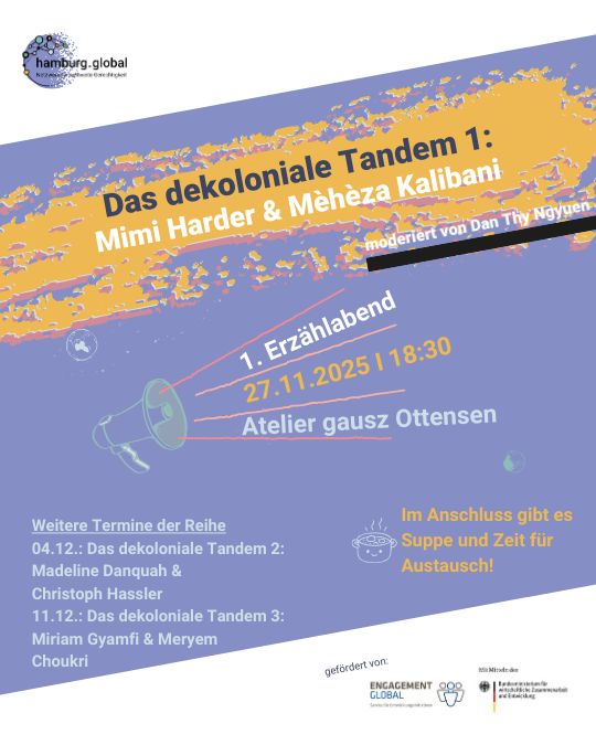Jetzt schnell anmelden! Wir freuen uns, an diesem Abend Mimi Harder & Mèhèza Kalibani zu einem Live-Interview einzuladen, um ihre Perspektiven und Erfahrungen mit Dekolonisierung kennenzulernen!